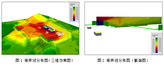 (1) 室外等声线分布三维效果图(见图1)、截面图(见图2)、平面图、建筑外立面图等;