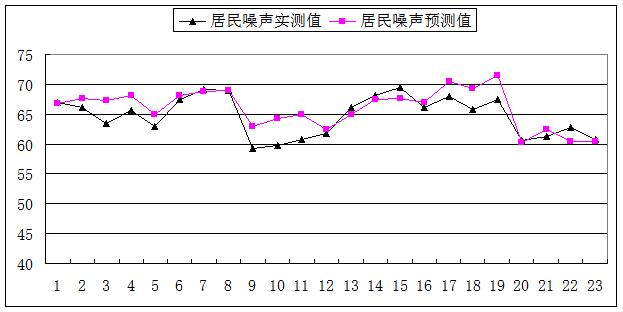 图4 居民环境噪声实测值与预测值对照曲线图
