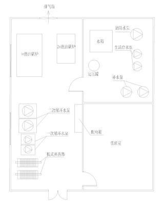 本工程位于北京市海淀区五棵松桥西,噪声源为燃油锅炉及循环水泵,机房位于居民的斜下方,设备布置平面图如下所示: