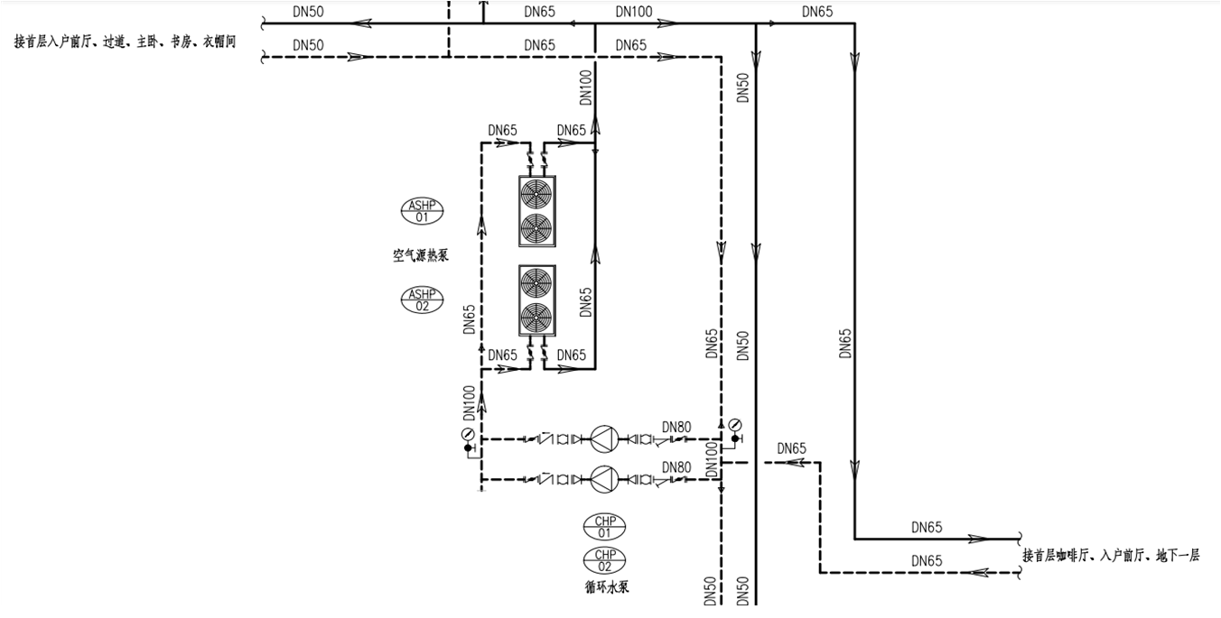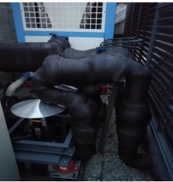 本项目位于鼓楼24号院屋顶,该项目屋顶有两台风冷模组与2台冷却水循环泵,管道穿墙进入室内。由于空调设备没有采取相应的减振措施,导致设备运行时振动及噪声影响室内人员休息。为减轻室内噪声影响,我方对空调设备进行了降噪处理。系统原理图如下所示