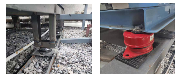 原有风冷模组机组与钢结构框架之仅用一层橡胶垫做减振措施,风冷模组运行所产生的振动可以通过钢结构与屋面直接传入室内。根据风冷模组原有情况我方现对风冷模组进行了两级减振。钢结构框架与地面槽钢之间重新焊接支撑并安装ZA39-40橡胶减振器作为一级减振。此外我方在风冷模组与钢结构框架之间安装ZD-7弹簧减振器与橡胶减振垫作为二级减振。两级减振措施大大减少因风冷模组振动对室内的影响,具体做法如下: